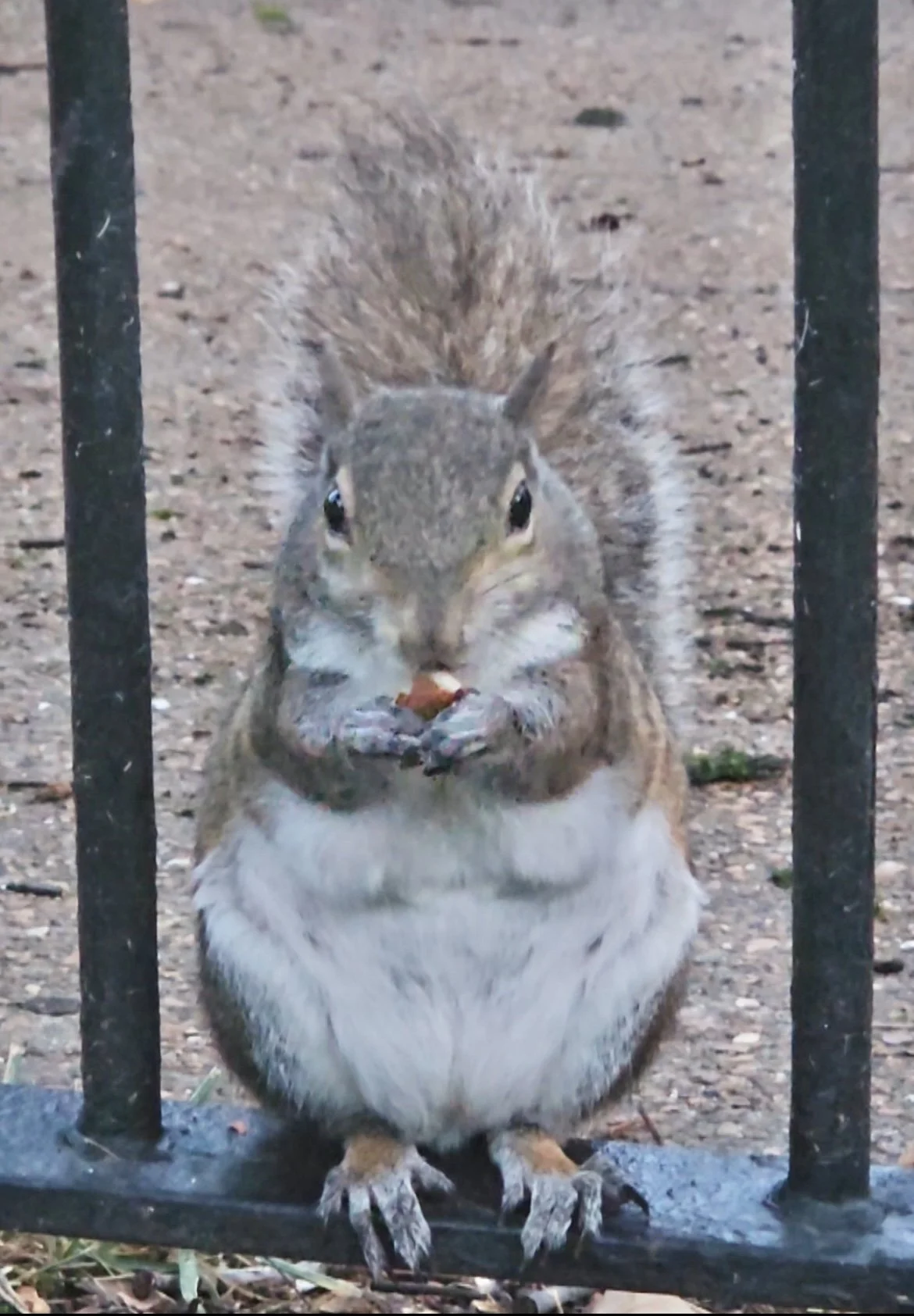 Meet Hilary, a charming squirrel who is far from ordinary. She has lived in my home for one winter, during which I taught her to stand up and wave—sometimes even jumping while doing so! With her large, expressive eyes and the striking white fur around them (known as the "spectacle" or "eye ring"), she is one of the prettiest squirrels I've ever seen. Her face and jaw are also beautifully white, which gives her a distinct, elegant look. As a mother, she and her daughter Honeymoon share an uncanny resemblance, and Hilary is a loving and responsible mom. Hilary’s favorite treats include avocado and croissants, and she’s remarkably polite around other squirrels, never acting aggressively. Sweet, smart, and full of personality, she can even fit exactly 2.5 pecan halves in her mouth!